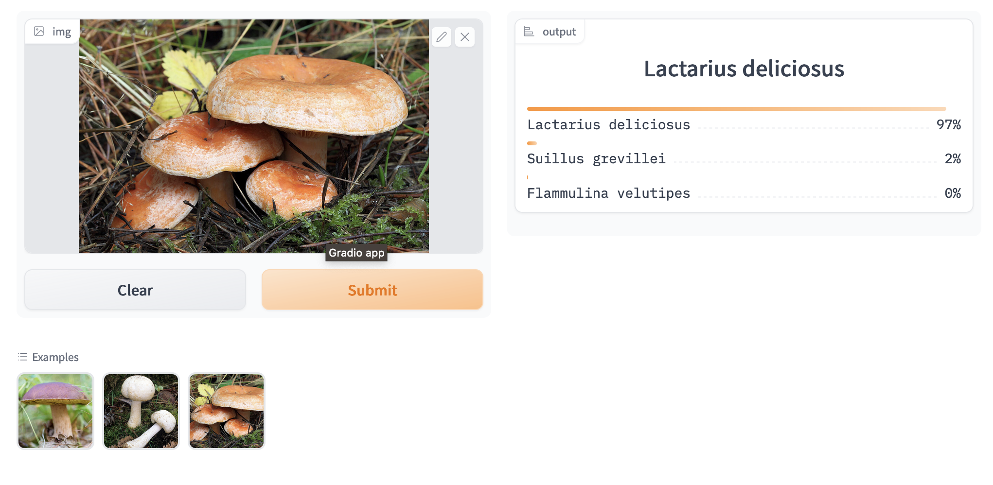 The current best mushroom model is deployed as a simple Gradio app with which users can upload images to be classified.