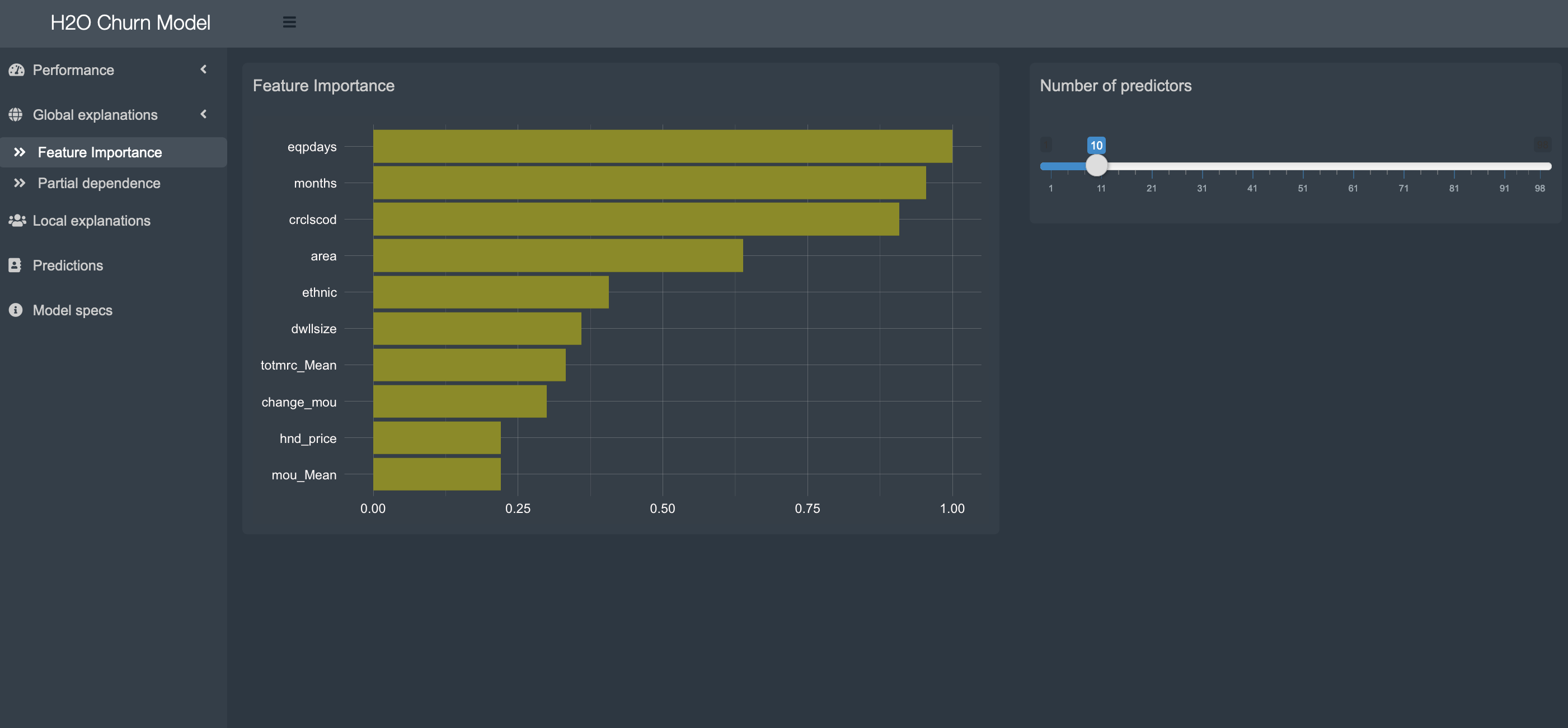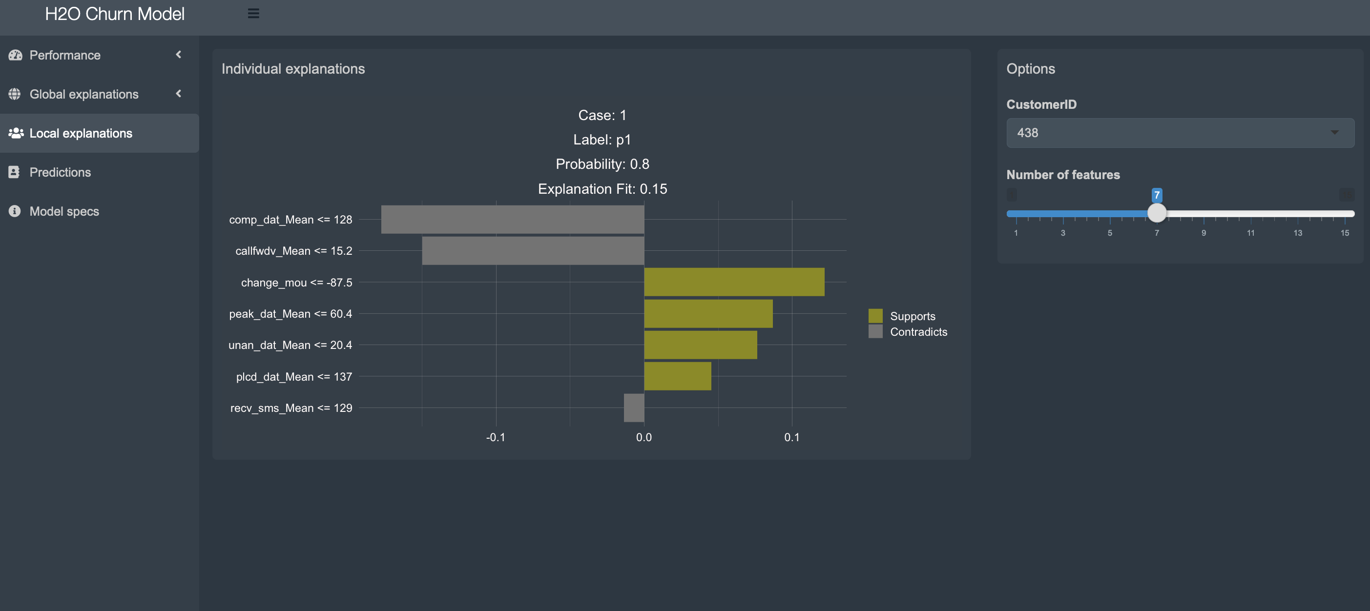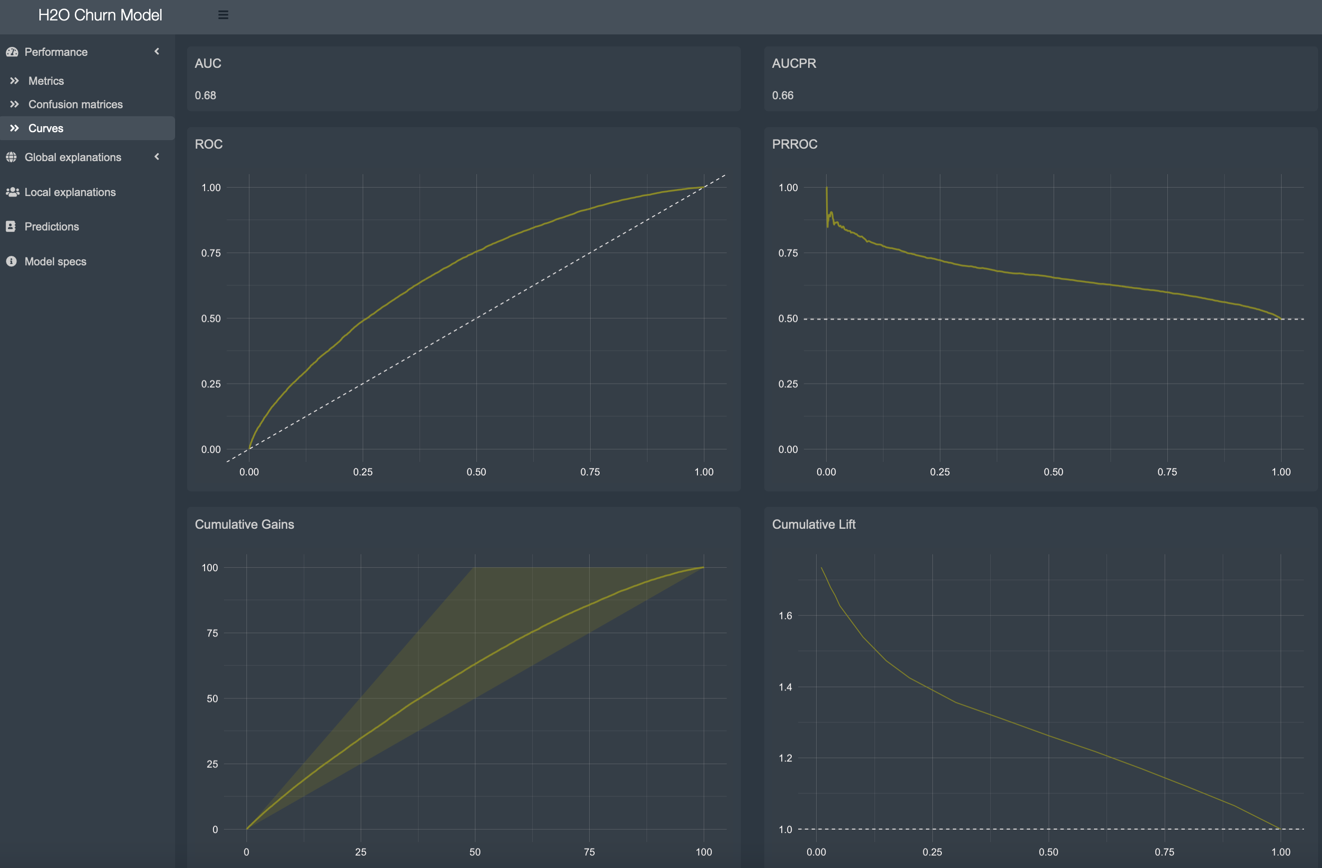 Explain churn prediction models to stakeholders in terms of performance and predictions. This app was created using shinydashboard and the H2O ML framework. It allows you to inspect various performance metrics as well as local and global explanations of predictions.